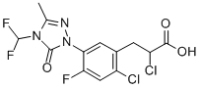 中文别名: (RS)-2-氯-3(2-氯-5-(4-二氟甲基-4,5-二氢-3-甲基-5-氧-1H-1,2,4-三唑-1-基)-4-氟苯基)丙酸乙酯;福农;唑草酯 英文名称: carfentrazone 英文别名: Affinty;ethyl (RS)-2-chloro-3-(2-chloro-5-(4-difluirimethyl-4,5-dihydro-3-methyl-5-oxo-1H-1,2,4-triazol-1-yl)-4-fluorophenyl)propionate;ethyl-2-dichloro-5-(4-(difluoromethyl)-4,5-dihydro-3-methyl-5-oxo-1H-1,2,4-triazol-1-yl)-4-fluorobenzenepropanate;carfentrazone (free acid);CARFENTRAZONE;ethyl-(RS)-2-chloro-3-[2-chloro-5-(4-difluoromethyl-4,5-dihydro-3-methyl-5-oxo-1H-1,2,4-triazol)-4-fluorophenyl] propionate;F 116426;F 8426;2-chloro-3-{2-chloro-5-[4-(difluoromethyl)-3-methyl-5-oxo-4,5-dihydro-1H-1,2,4-triazol-1-yl]-4-fluorophenyl}propanoic acid; 分子式: C13H10Cl2F3N3O3分子量: 384.138 InChI: InChI=1/C13H10Cl2F3N3O3/c1-5-19-21(13(24)20(5)12(17)18)10-3-6(2-8(15)11(22)23)7(14)4-9(10)16/h3-4,8,12H,2H2,1H3,(H,22,23) 密度: 1.67g/cm3沸点: 472.8°C at 760 mmHg 闪点: 239.7°C