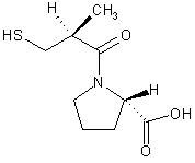 卡托普利(疏甲丙脯酸、甲疏丙脯酸、开搏通) Captopril (Capote, Lopirin, Tensiomin) 化学名称:1-(3-巯基-2-D-甲基丙酰基)-L-脯氨酸 英文化学名称: 1-(3-Mercapto-2-methyl-1-oxopropyl)-L-proline;D-2-Methyl-3-mercaptopropanoyl-L-proline; 分子式为:C9H15NO3S 分子量:217.28 CAS号:62571-86-2 熔点:103-108°C 比旋光度:-129.5° (c=1, EtOH) 临床应用:用于治疗各种类型的高血压症,尤对其他降压药治疗无效的顽固性高血压,与利尿剂合用可增强疗效,对血浆肾素活性高者疗效较好。也用于急、慢性充血性心衰,与强心剂或利尿剂合用效果更佳。 Captopril is an angiotensin-converting enzyme (ACE) inhibitor used for the treatment of hypertension and some types of congestive heart failure. Captopril was the first ACE inhibitor developed and was considered a breakthrough both because of its novel mechanism of action and also because of the revolutionary development process. Captopril is commonly marketed by Bristol-Myers Squibb under the trade name Capoten.